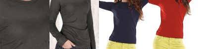 - 1X1 rib seamed collar w/double-needle coverstitching on neck; Tagless label