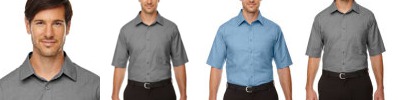 55% cotton, 45% polyester with stain-release; Extra stitching at seams and buttons; Flat-felled seam finishing; Wrinkle-Resistant; Short-sleeves; Full back yoke and back pleat; Button-down collar and left-chest pocket;