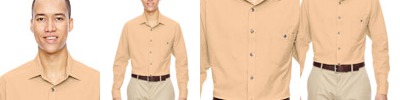 3.4 oz., 55% cotton, 45% polyester; Fine yarn count shirting; True Non-iron performance straight from the dryer; stain release finish; Classic Fit for professional appearance; Patented pucker-free taped seams; Fused collar cuffs and placket; Split back seam with bias cut back yoke; straight collar; pearlized buttons;