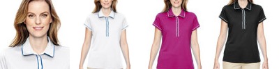 Moisture wicking, antimicrobial and UV protection performance; 100% polyester; Snag protection tricot with stripe print, 4 oz./yd2/135 gsm; matching jacquard knit collar; y-neck with matching jacquard knit collar; back waist darts;