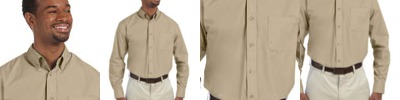100% cotton denim; Inside, flat-felled seams; Khaki double-needle topstitching; Left-chest pocket and signature twill tape at neck; Fully constructed front placket with button-down collar; Signature horn-style buttons with Harriton logo; Buttons use contrast thread;