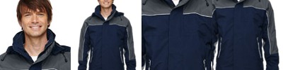 7.5 oz/yd2 / 250 gsm, 3-Layer 96% polyester, 4% spandex bonded to 100% polyester jersey with inner membrane; Polyester/spandex terry inserts; 8,000 mm waterproof rating; 800 g breathability rating; inside storm placket with chin guard; front reverse coil zipper with semi-autolock rubber pull tab; front reverse coil zippered laser cut pockets; left sleeve reverse coil zipper laser cut pocket ; reflective piping at front and back shoulder yoke; laser perforation at upper back for added breathability; reflective heat transfer decoration at lower sleeves; audioport access through inside left pocket; adjustable shockcord at hem;