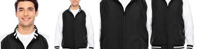 2.8 oz., abrasion-resistant 100% nylon taslan shell with polyurethane coating for enhanced wind- and water-resistance; 3.2 oz., 100% polyester dyed-to-match tricot big hole mesh lining in body; 100% polyester white taffeta lining in sleeves; striped 3½" 1x1 rib knit trim at bottom hem, cuffs and inside collar; EZEM zipper at inside side seam and inside left-chest for easy decoration access; center front dyed-to-match old school molded plastic zipper; molded plastic zippers at front welt pockets;