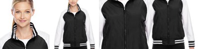 2.8 oz., abrasion-resistant 100% nylon taslan shell with polyurethane coating for enhanced wind- and water-resistance; 3.2 oz., 100% polyester dyed-to-match tricot big hole mesh lining in body; 100% polyester white taffeta lining in sleeves; striped 3½" 1x1 rib knit trim at bottom hem, cuffs and inside collar; EZEM zipper at inside side seam and inside left-chest for easy decoration access; center front dyed-to-match old school molded plastic zipper; molded plastic zippers at front welt pockets;