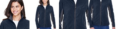 100% polyester anti-pill microfleece, 6.3 oz./yd2/215 gsm; center front contrast reverse coil zippers; laser welded sleeve pocket for personal compact audio device; contrast zippered front pockets with zipper garages; adjustable shockcord at hem; contrast underam panels and inner collar;