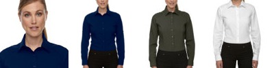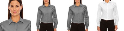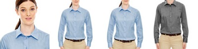 60% cotton/40%polyester yarn-dyed dobby, 3.3oz./yd2/112gsm; Wrinkle resistant finish; Classic dress collar; Front princess seams; back waist darts; Back yoke; Adjustable cuffs;